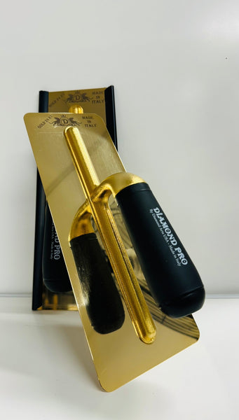 Limited Edition: golden Venetian plaster trowel, beveled edges, 280 x 120x0.6 mm, golden aluminum / rubber handle.
