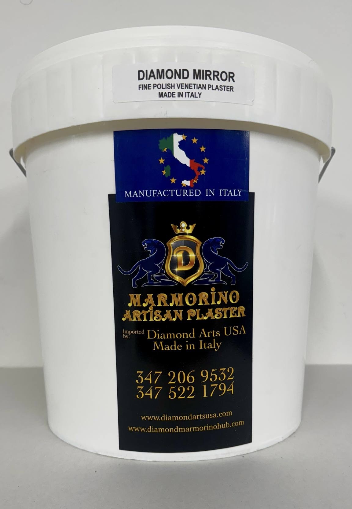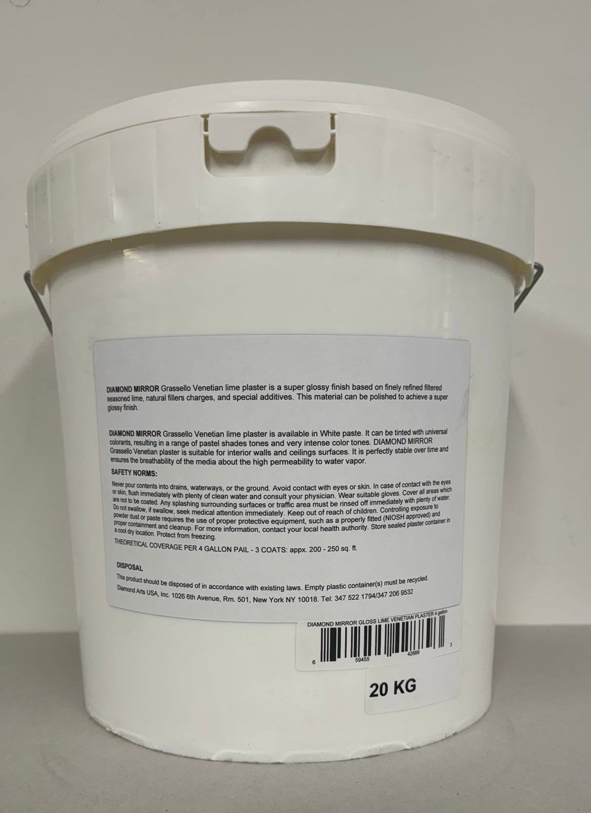 DIAMOND Mirror fine Marmorino Plaster is a super glossy finish based on finely refined filtered seasoned lime, natural fillers charges, and special additives. This material can be polished to achieve a glossy finish. Diamond Mirror fine Marmorino Plaster is available in White or colored paste on request. It can be tinted with universal colorants, resulting in a range of pastel shades tones very intense color tones.
